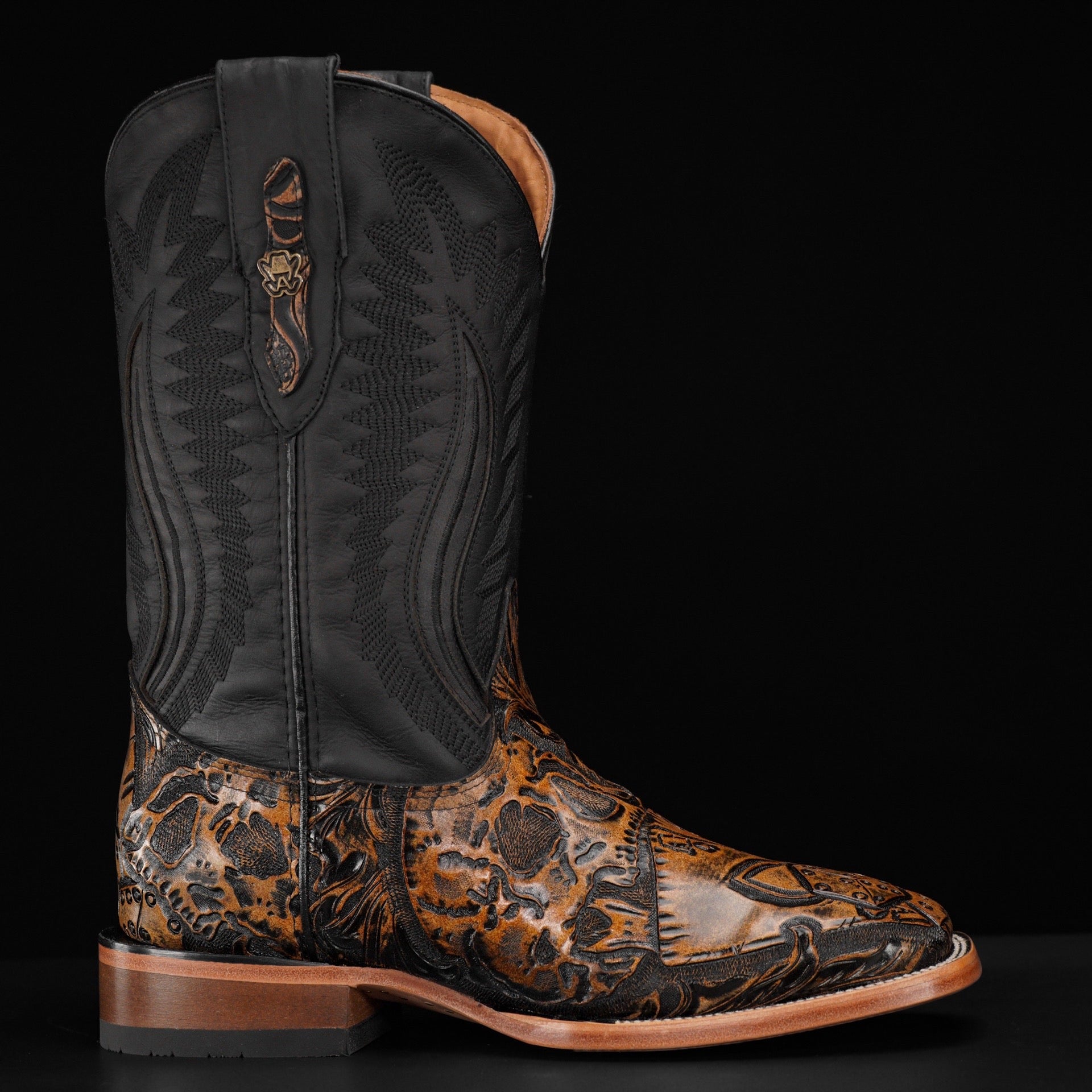 • The vamp, heel and pull straps are hand tooled.